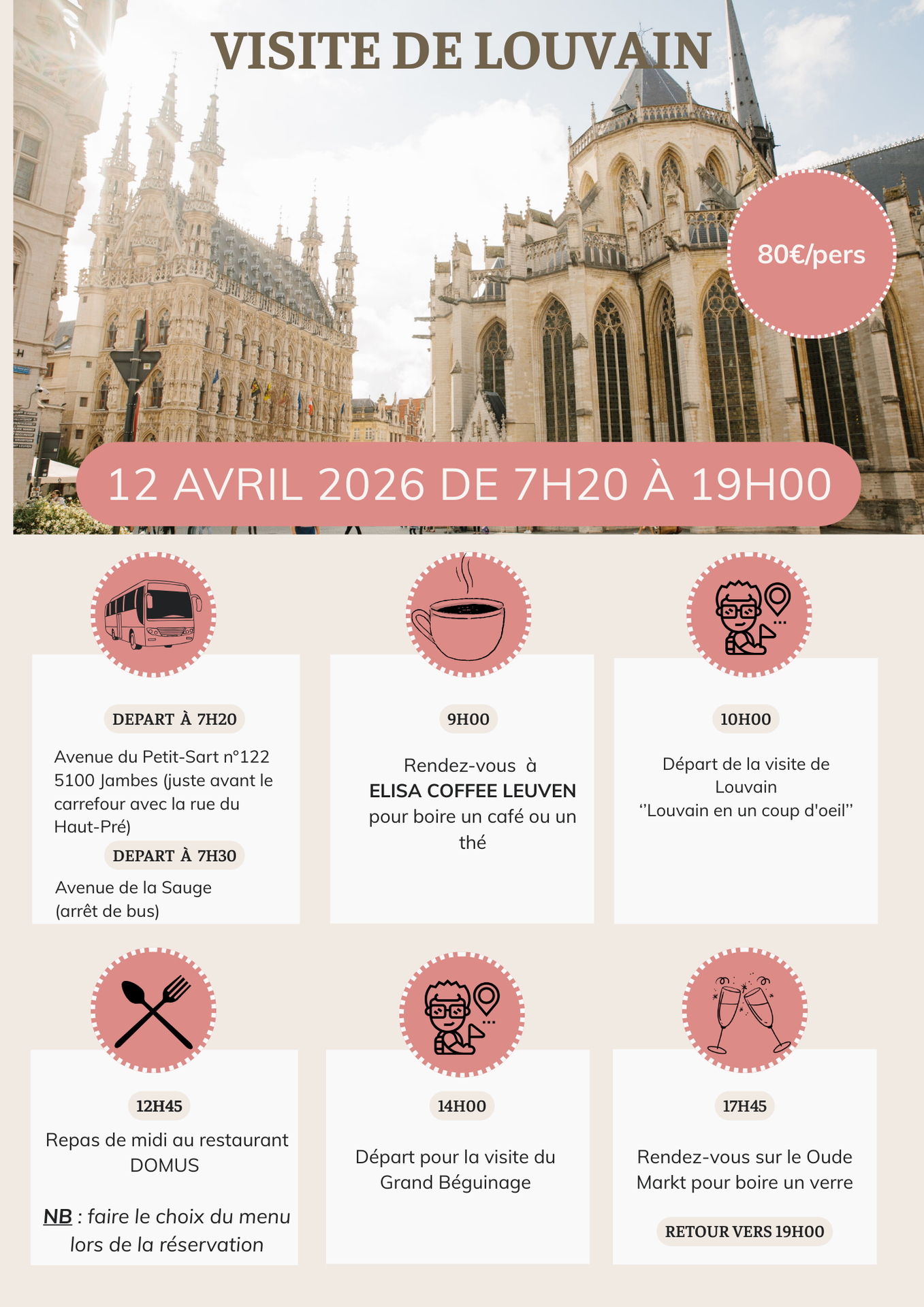 Partez à la découverte de la ville de Leuven lors d’une visite conviviale et culturelle. Cette activité vous permettra d’explorer ses lieux emblématiques, son patrimoine historique et l’atmosphère chaleureuse de ses ruelles et places animées. Une belle occasion de passer un moment enrichissant en groupe et de (re)découvrir une ville pleine de charme.